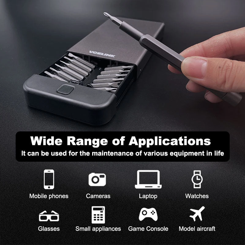 VCELINK Precision Screwdriver Set includes a variety of commonly used bits to meet your daily needs. It can help fix and clean devices and accessories like glasses, computers, smartphones, game consoles, tablets, pocket knives, cameras, switches, iPods, iPhones, MacBook, PlayStations, batteries, kids’ toys, jewelers, etc. It is easy to carry and store in your pocket or toolbag.