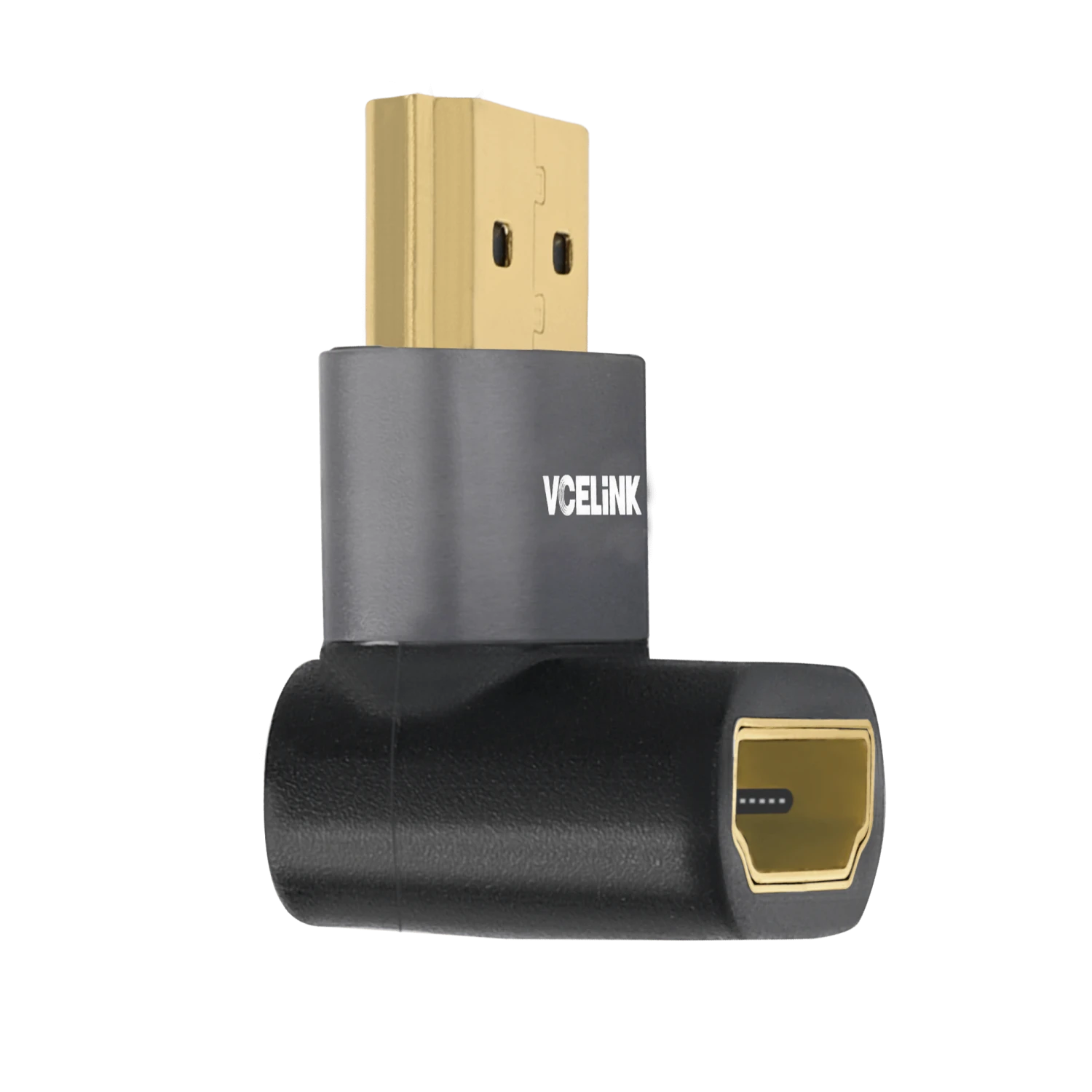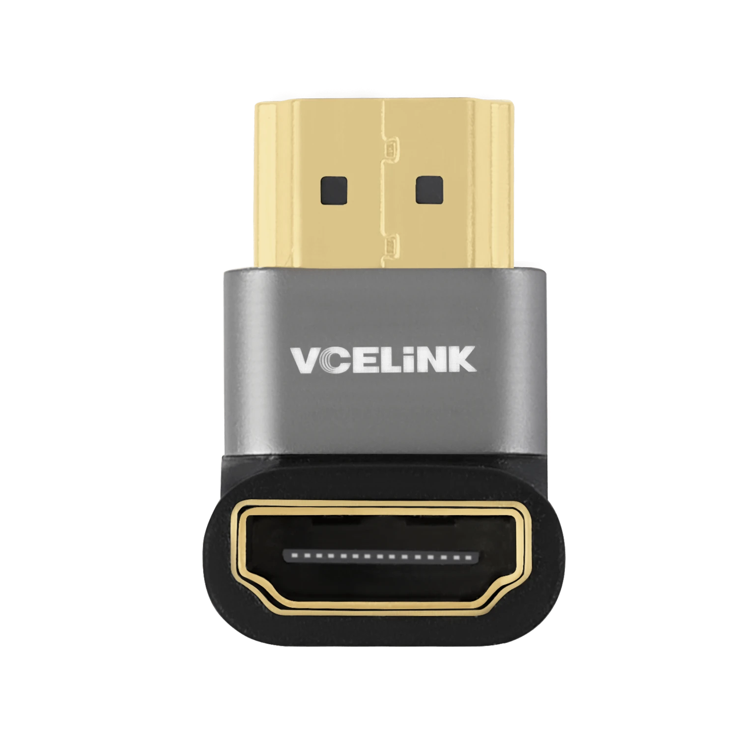 VCELINK 8K 270-Degree Male-to-Female HDMI Adapter is designed to optimize HDMI connections in tight spaces between wall-mounted devices. Its 270-degree right-angle design makes the HDMI port more accessible by directing it upwards or downwards, preventing excessive cable bending and minimizing strain on device ports. Compliant with HDMI 2.1 standard, this adapter supports the latest 8K HDMI technology, providing stunning picture and video quality for home theaters, gaming setups, and professional AV applications. To ensure optimal performance, use HDMI 2.1-compatible cables, devices, and ports, and make sure the connected cables are no longer than 2 meters to maintain signal integrity.