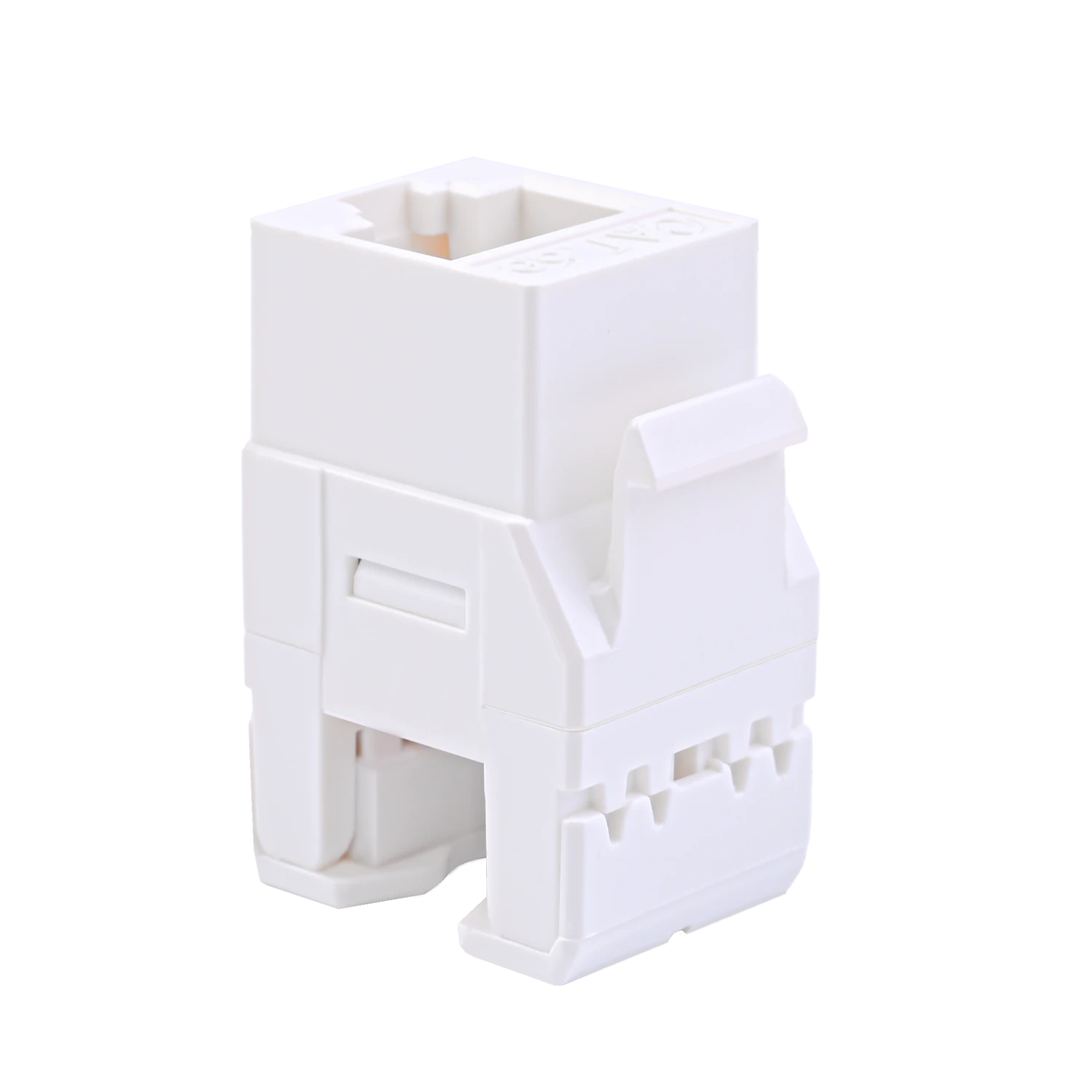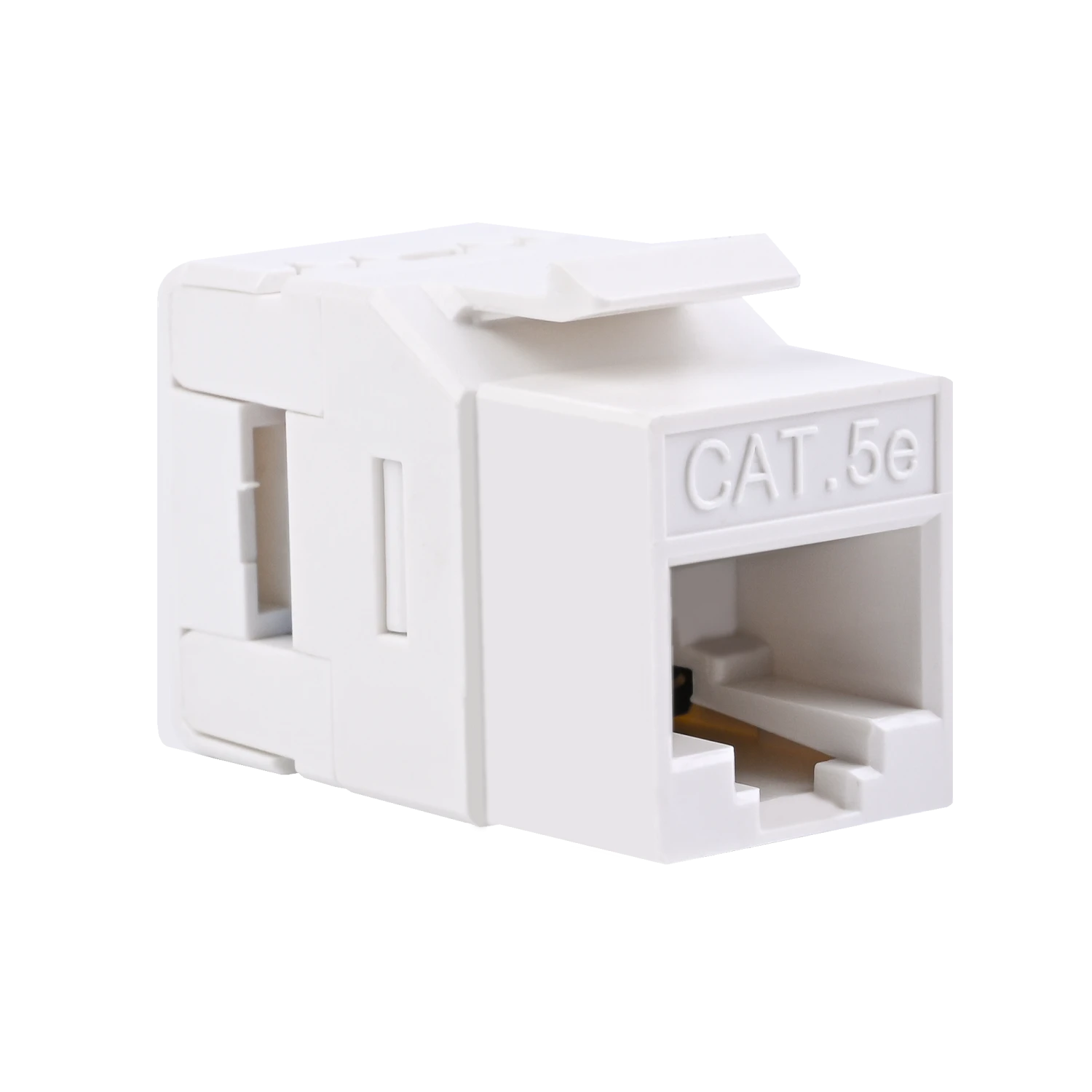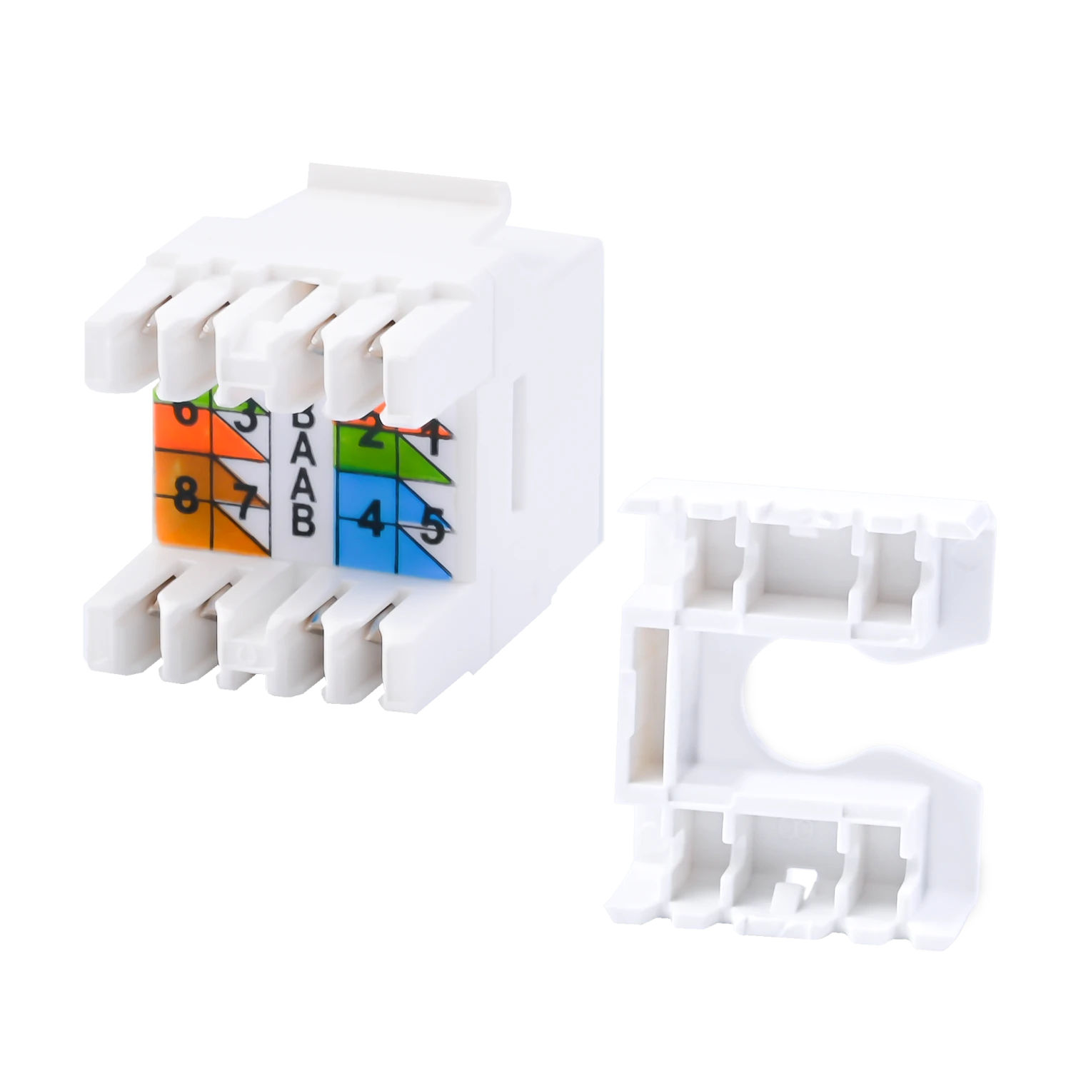VCELINK Cat5e Keystone Jack is designed for reliable Ethernet connections in structured cabling systems. The unshielded 180° design features a durable white polycarbonate housing and supports 22–23 AWG conductors. Compliant with T568A/B wiring standards and ANSI/TIA/EIA-568 specifications, it delivers up to 1000 Mbps transmission with 100 MHz bandwidth and supports IEEE 802.3af PoE applications.