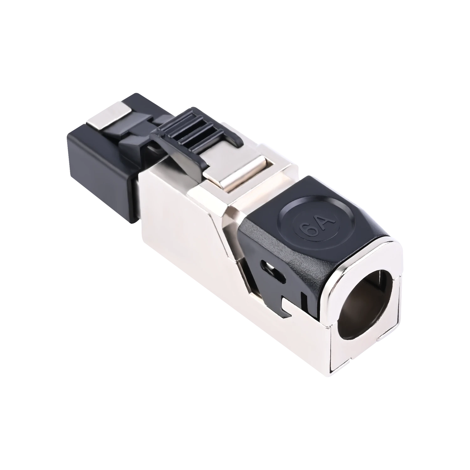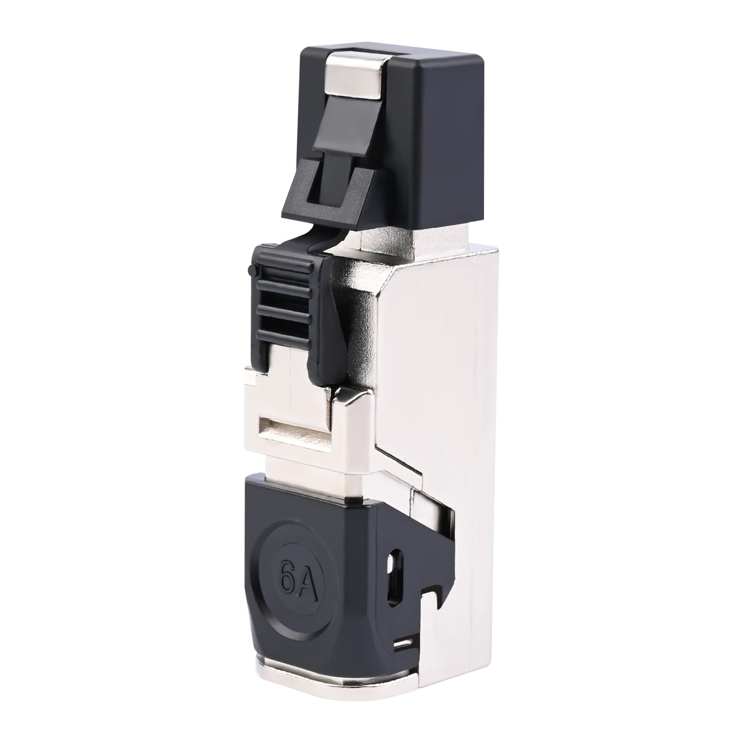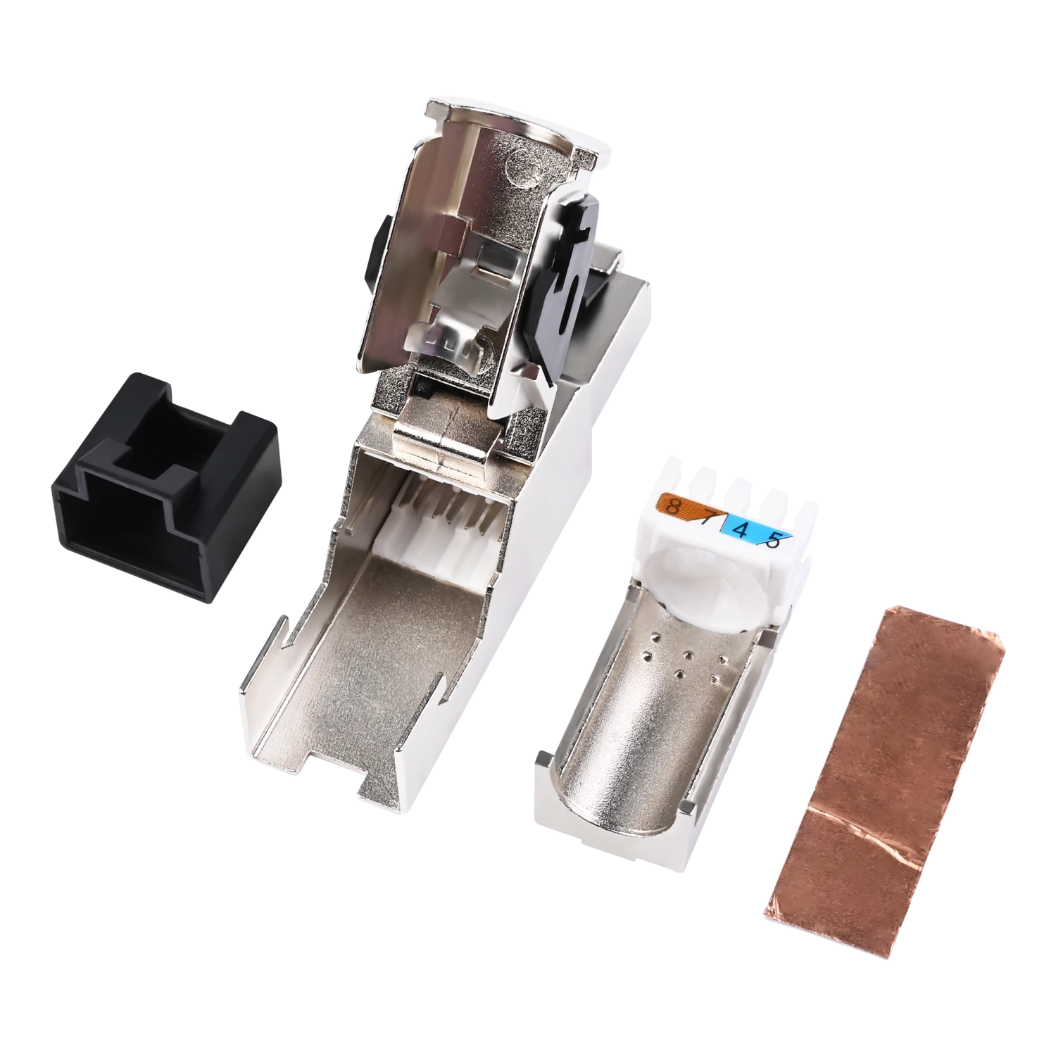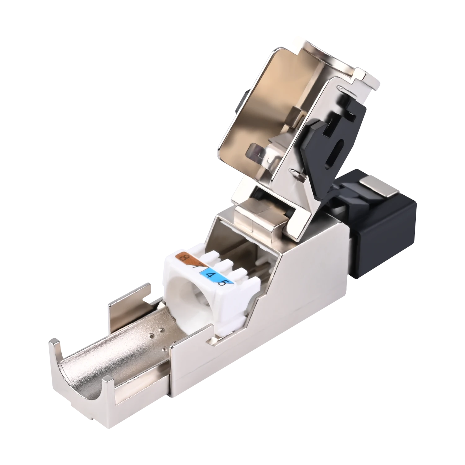 VCELINK newly designed toolless Cat6a field termination has upgraded the structure of the traditional shielded RJ45 connector and meets ANSI/TIA568-C.2 and ISO/IEC11801 standards. Our RJ45 connector has a unique locking design for easy and secure lock with the bottom cover. The plug features a zinc alloy shielding design, ensuring stable data transmission with less EMI, RFI or crosstalk noise. Color-coded load bar is integrated with the cable holder for quick wiring reference. The Cat6a field plug has a built-in strain relief design, protecting your cables from straining or stressing. All you need for Cat6a cable on-site termination is a wire stripper and a cutter. It is ideal for enterprise and data center network environments.