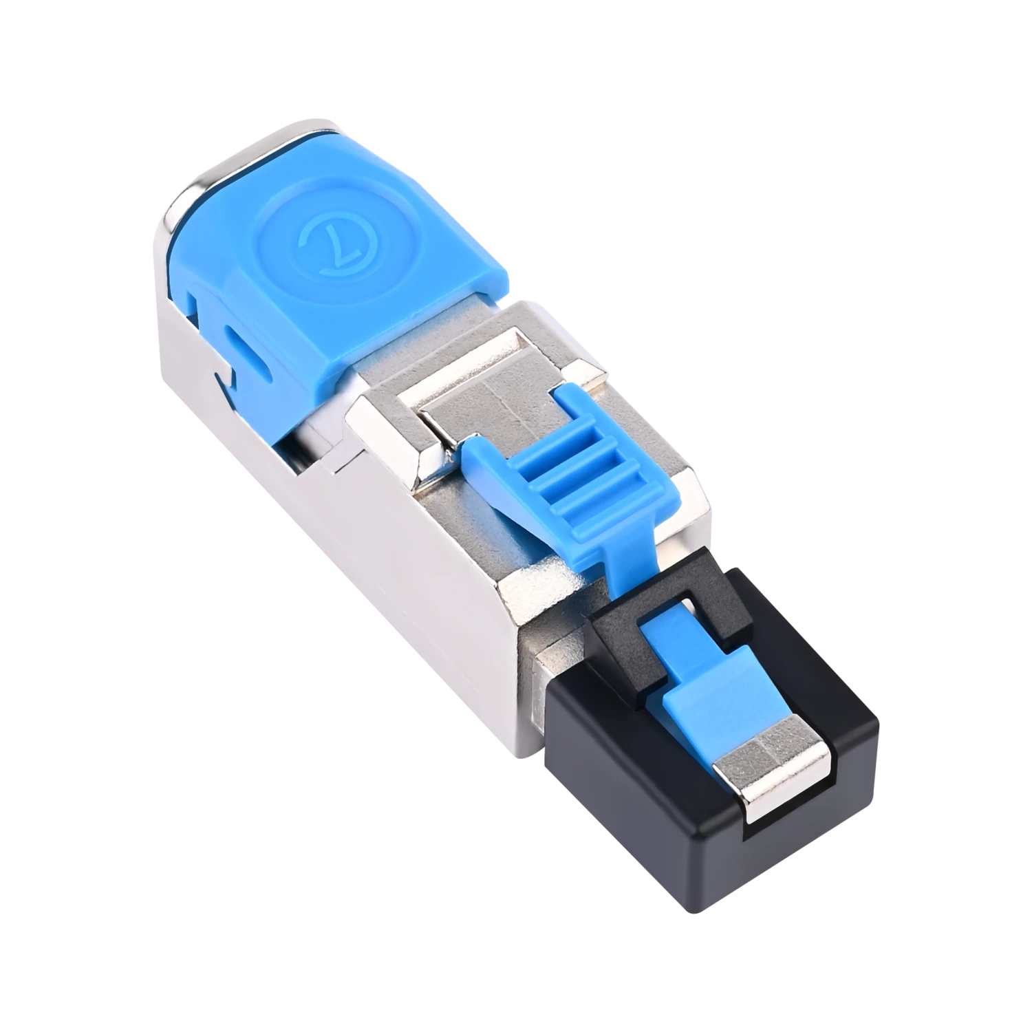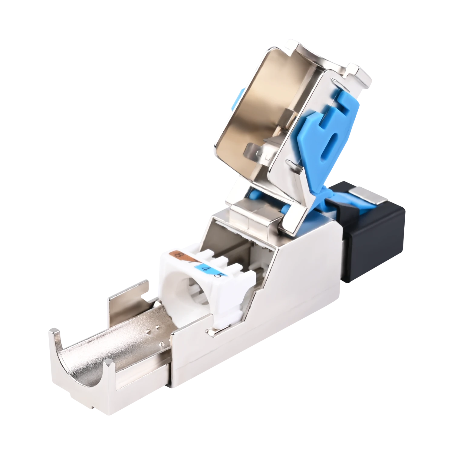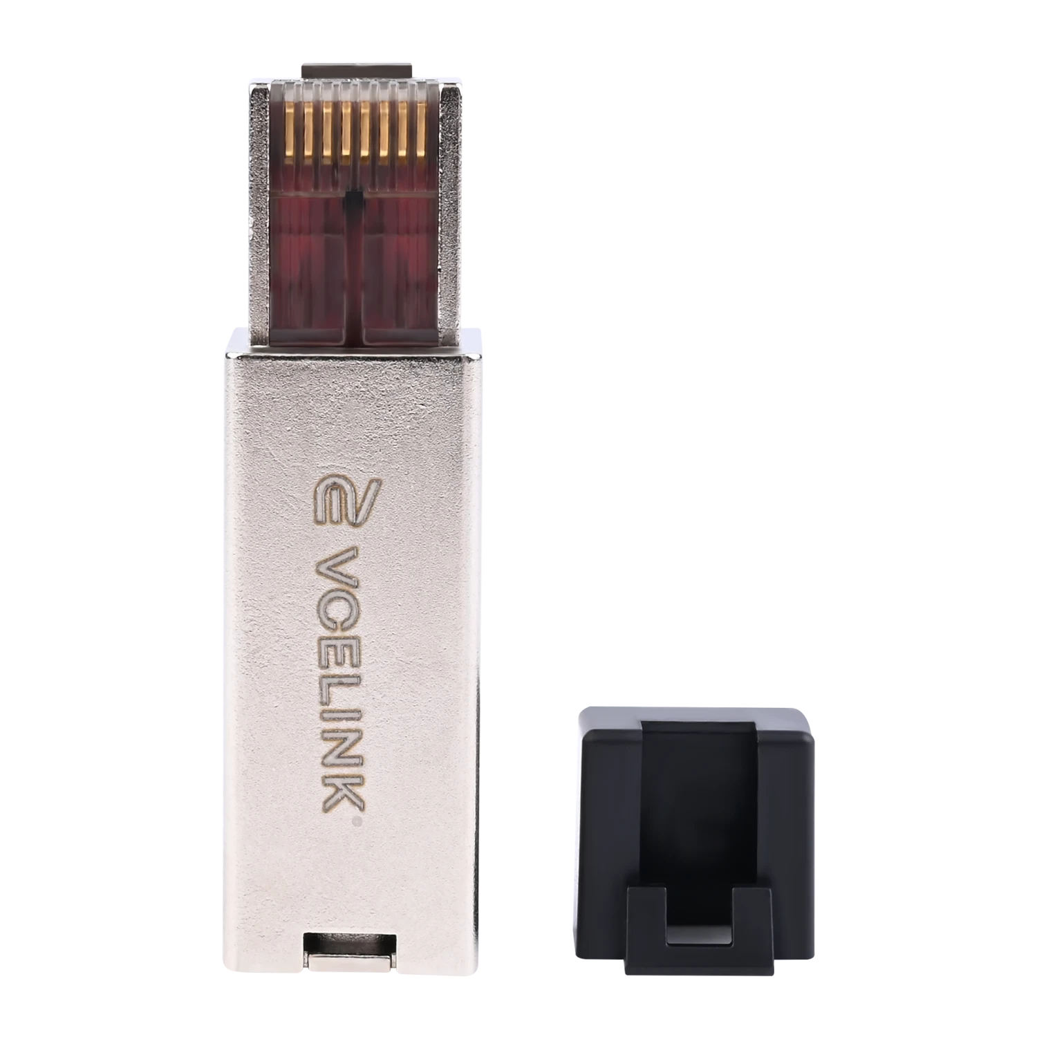 VCELINK tool free shielded Cat7 connector with locking cover is designed for a 10 Gbps and 600 MHz bandwidth network solution. It meets ANSI/TIA568-C.2 and ISO/IEC11801 standards. This Cat7 field termination plug features a unique locking design for easy and secure locking with the bottom cover. The plug features a zinc alloy shielding design, ensuring stable data transmission with less EMI, RFI, or crosstalk noise. The cable conductor holder smoothly slides into the RJ45 connector body for quick and hassle-free termination. The Cat7 field plug has an integrated strain relief design that helps protect your network cables from stress and potential damage.