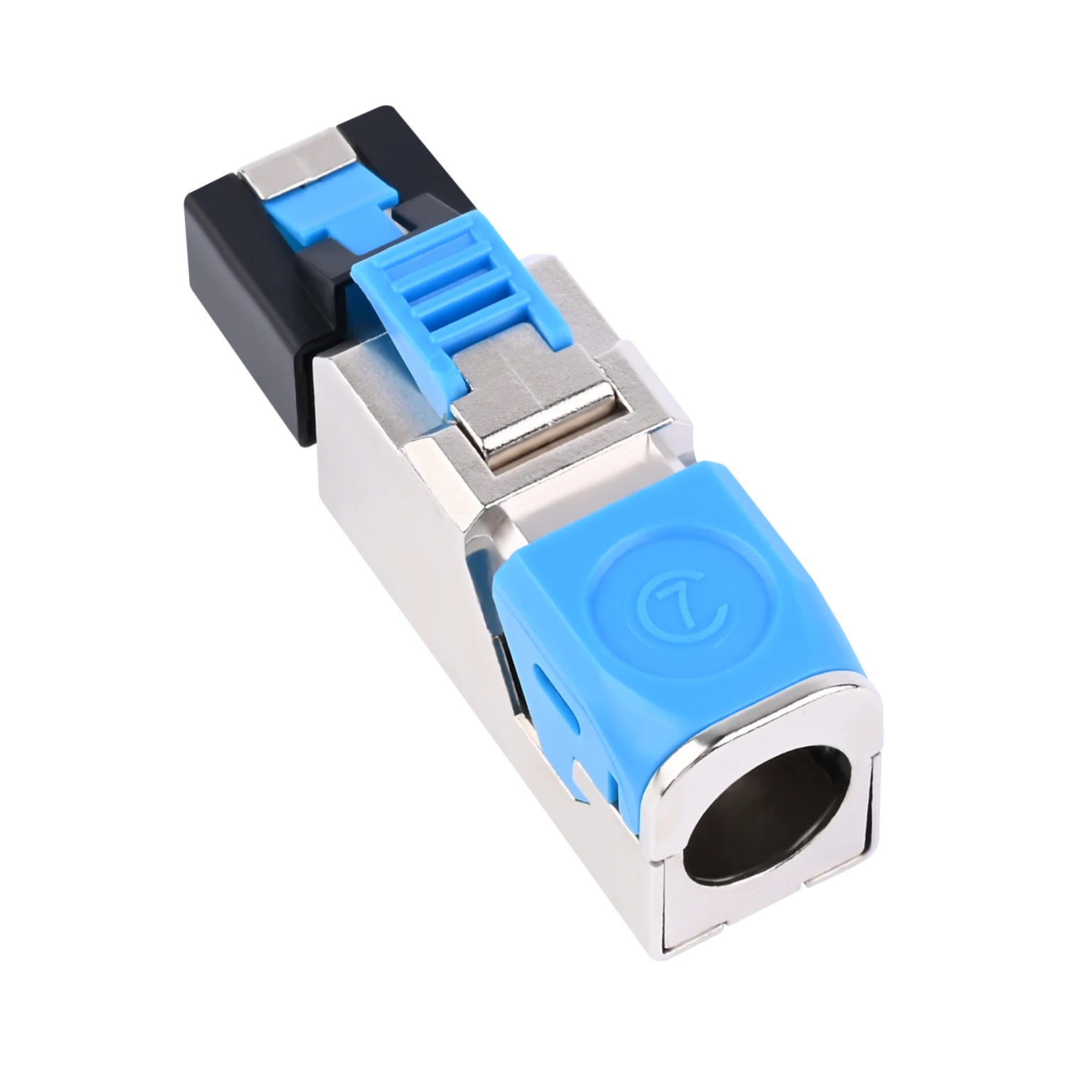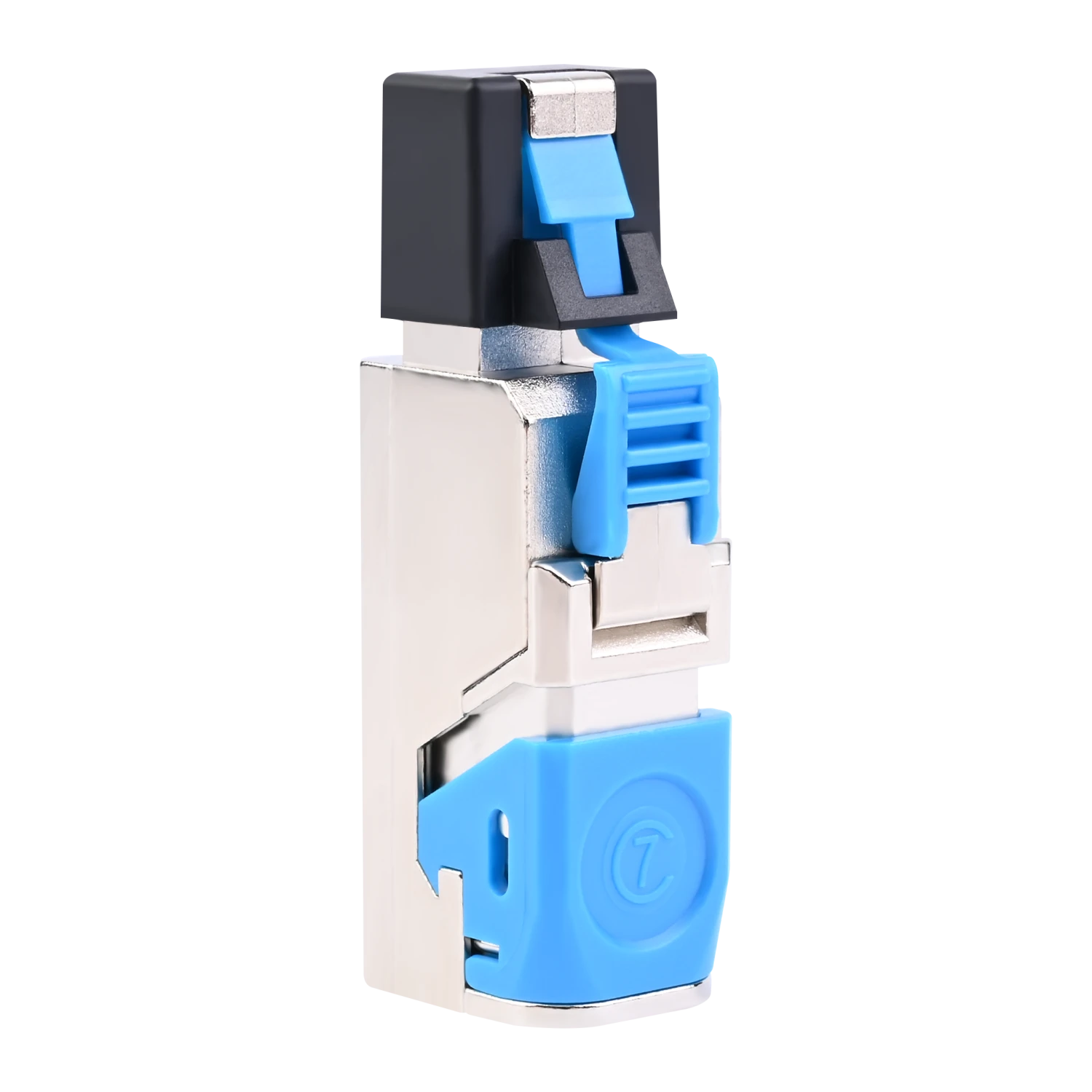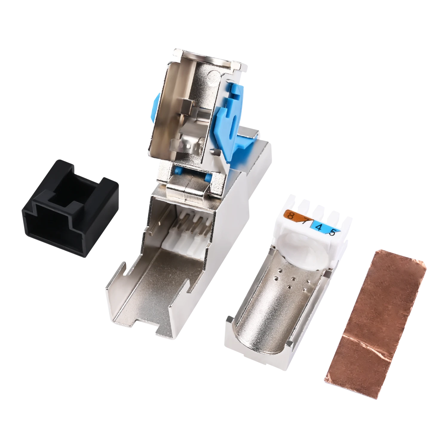 VCELINK tool free shielded Cat7 connector with locking cover is designed for a 10 Gbps and 600 MHz bandwidth network solution. It meets ANSI/TIA568-C.2 and ISO/IEC11801 standards. This Cat7 field termination plug features a unique locking design for easy and secure locking with the bottom cover. The plug features a zinc alloy shielding design, ensuring stable data transmission with less EMI, RFI, or crosstalk noise. The cable conductor holder smoothly slides into the RJ45 connector body for quick and hassle-free termination. The Cat7 field plug has an integrated strain relief design that helps protect your network cables from stress and potential damage.