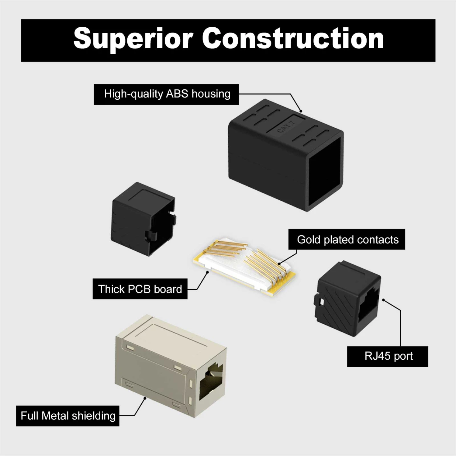 -Compatible with a variety of cable types, including Cat7, Cat6a, Cat6, Cat5e, and Cat5, shielded or unshielded, our inline coupler offers unparalleled versatility for your networking needs;