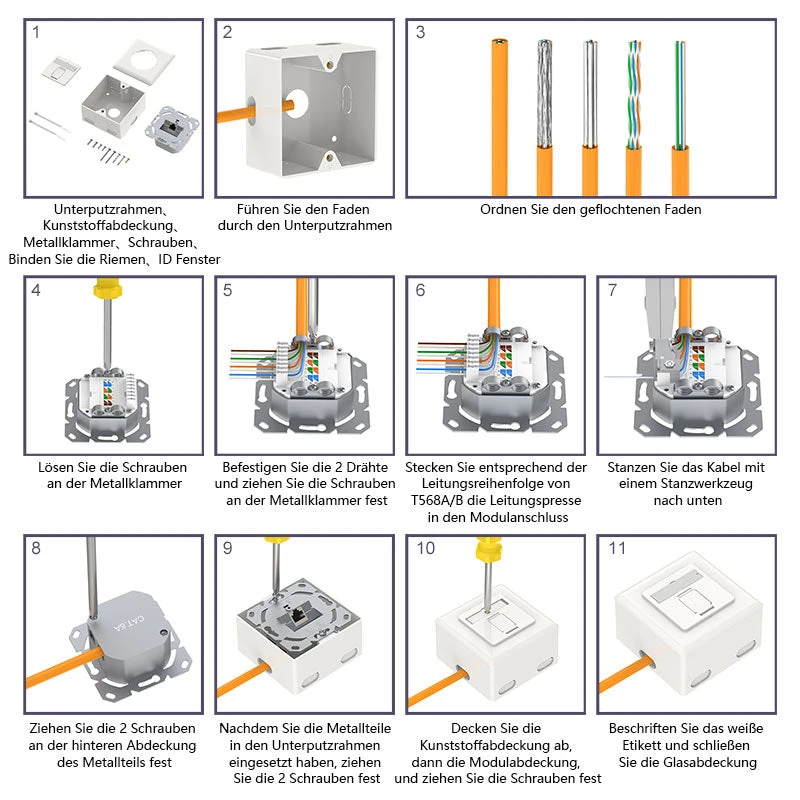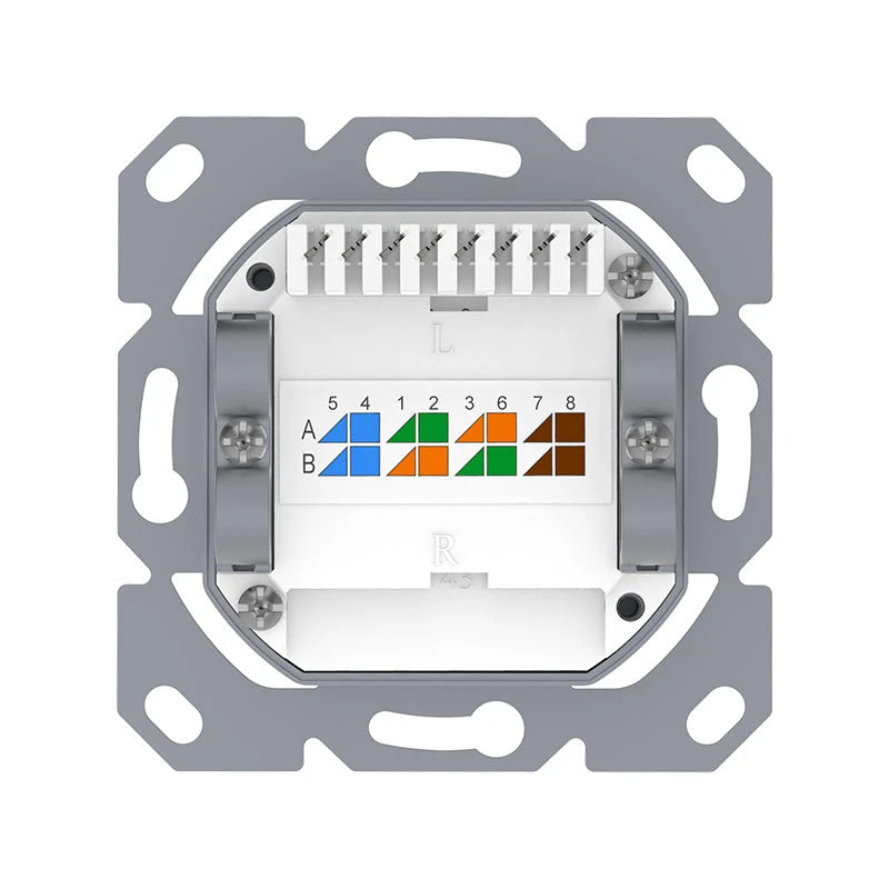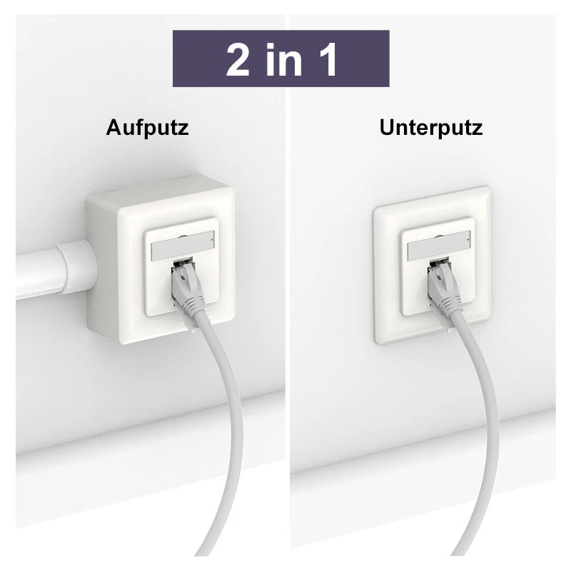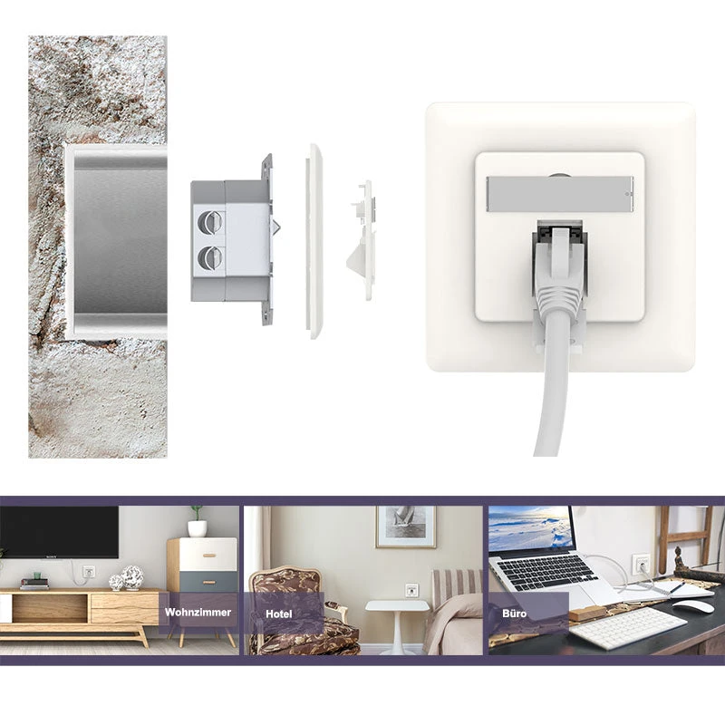 The German-like Cat6a wall plate is backward compatible with Cat5, Cat5e, and Cat6 connectors.