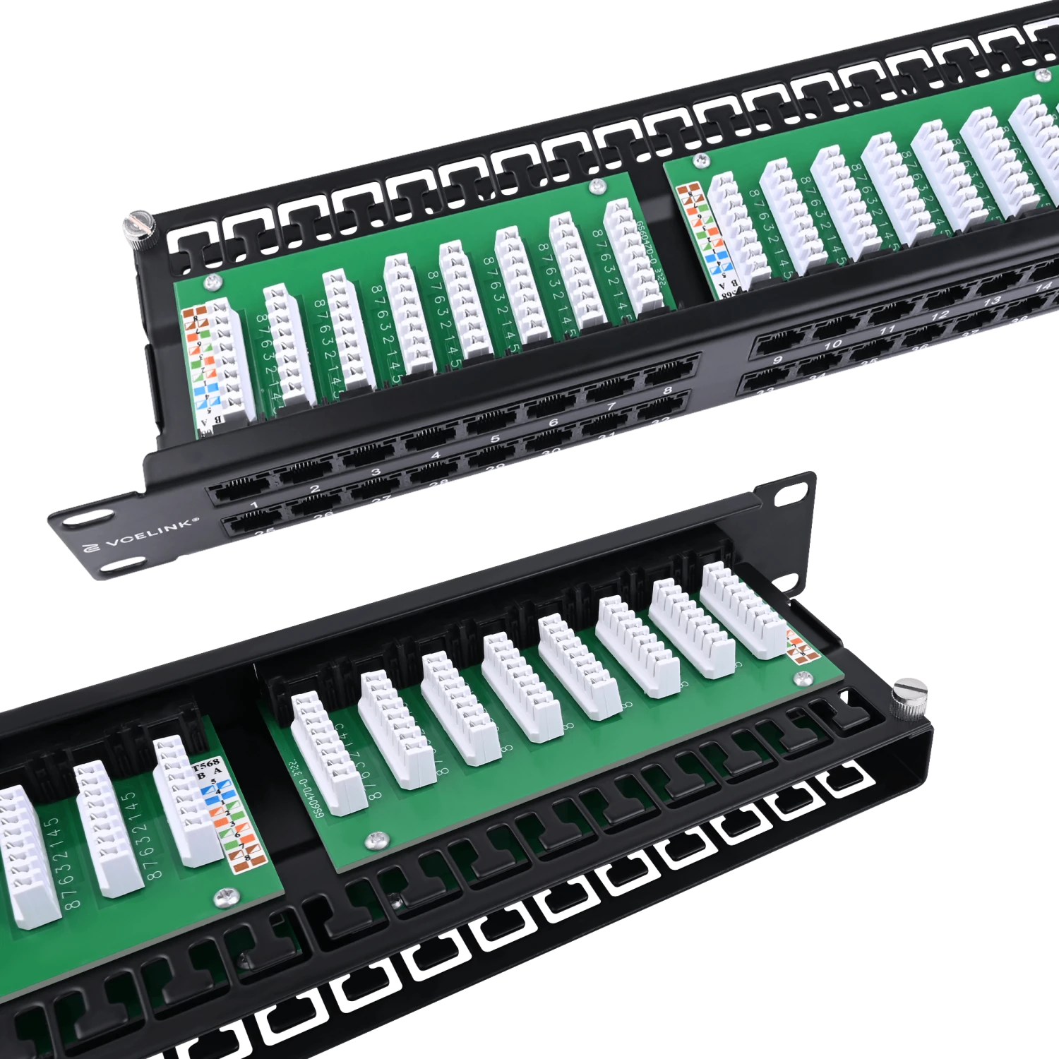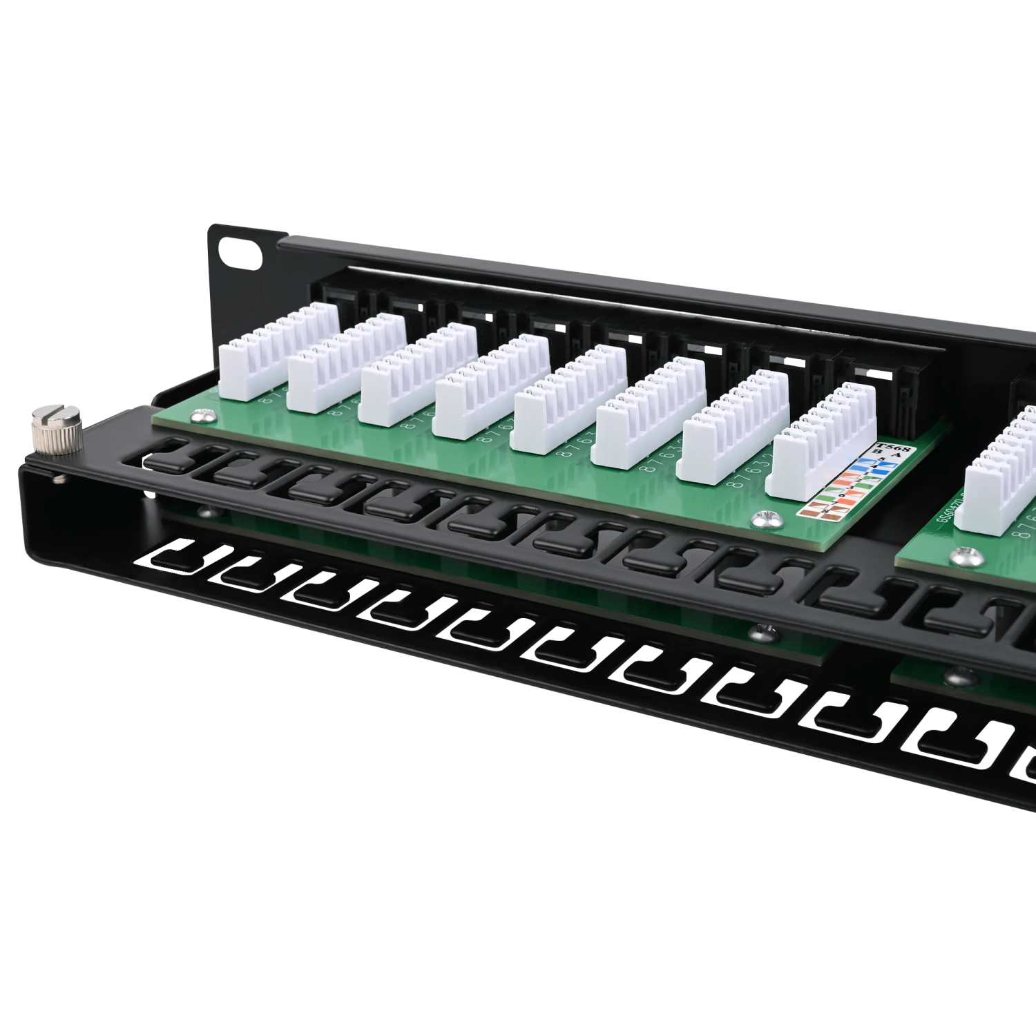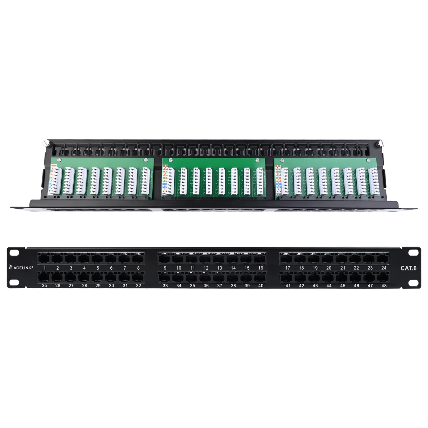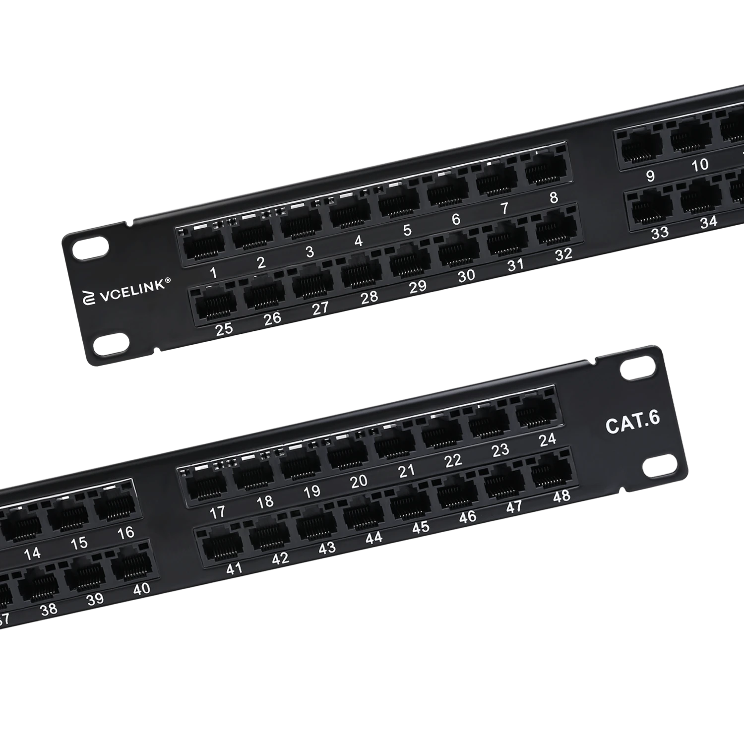 Optimize your data center space with our 48-port Cat6 UTP patch panel. Our patch panel meets Cat6 performance, delivering up to 1000 Mbps speed and 250 MHz bandwidth. The numbered RJ45 ports allow for easy cable identification and organization. The Cat6 cables can be easily terminated with 110 or Krone punch-down tools. This patch panel meets TIA/EIA 568B.2-1 industry standards and mounts easily to all standard 19-inch racks and cabinets. 1U and 48-port design make it ideal for high-density network environments, including data centers, enterprise networks, and large campus networks.