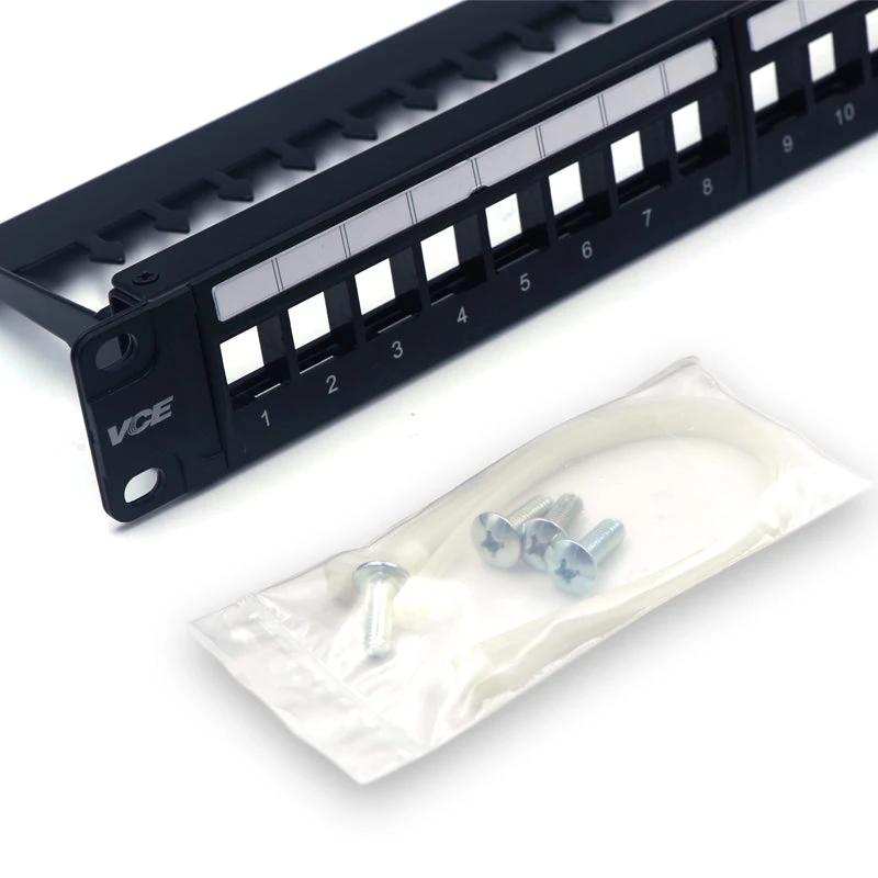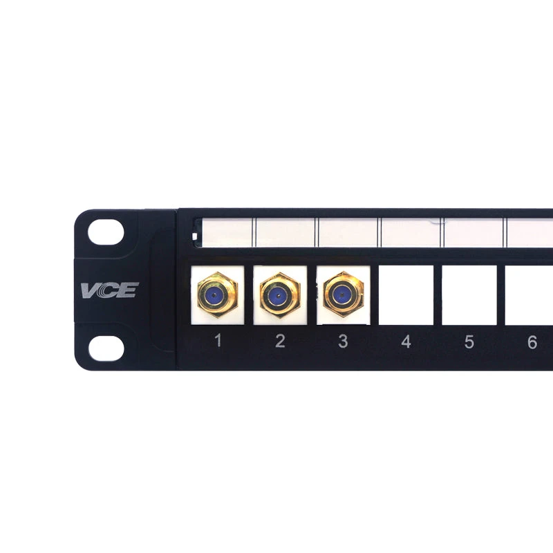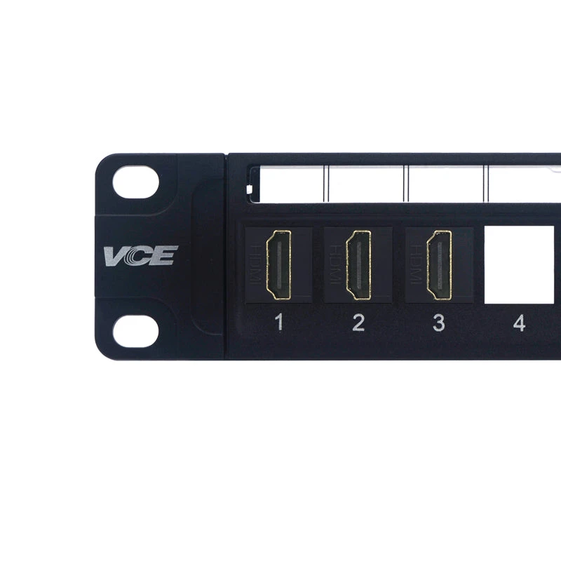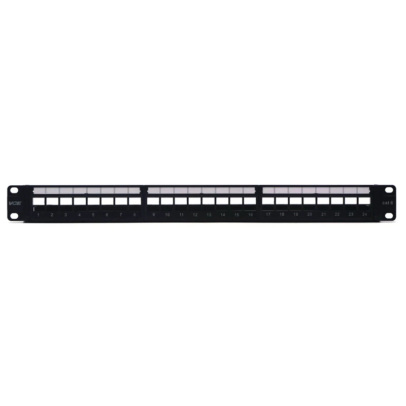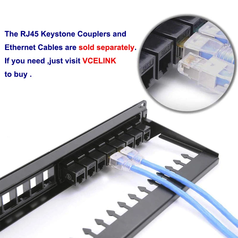 VCELINK 24-port Ethernet Patch Panel made of SPCC steel is corrosion-resistant, ensuring its long-term use and excellent durability. This patch panel provides multiple interfaces compatible with RJ45, RG6 coaxial, fiber optic, HDMI, etc. It is compatible with 19-inch racks, cabinets, or wall-mounted brackets with 1U (1.75 inches) standard height, providing various installation options for convenient use in different settings.