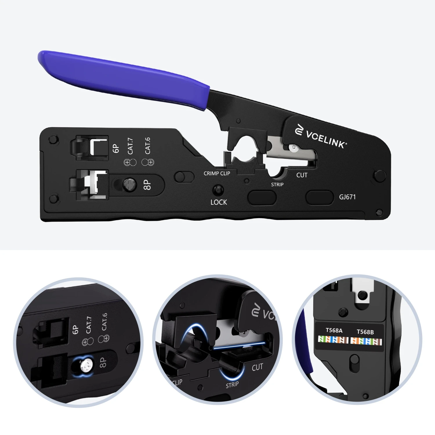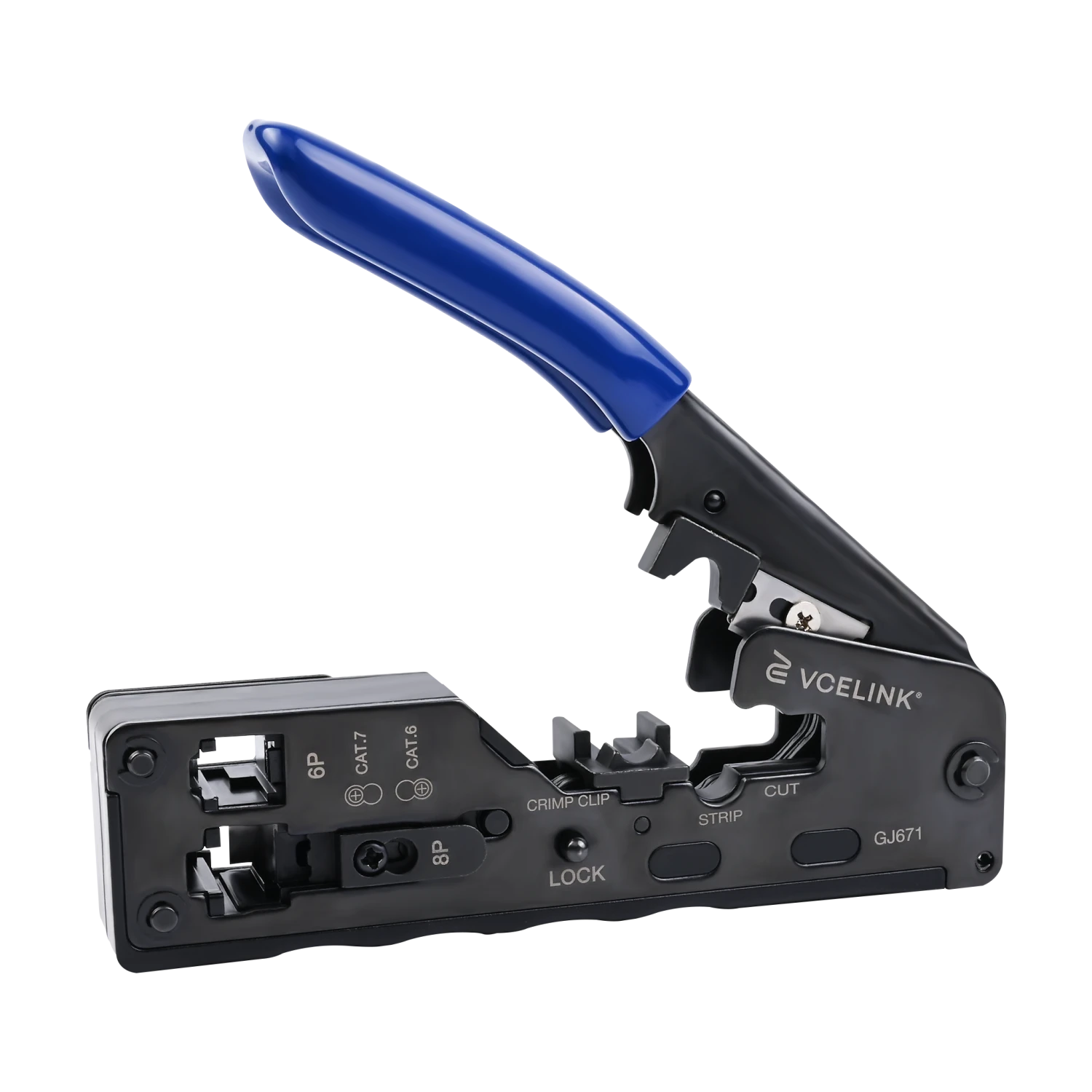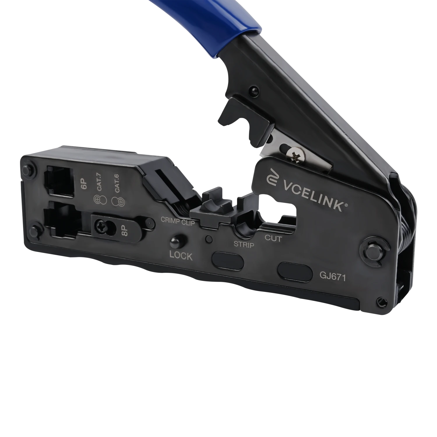 VCELINK Pass-Through RJ45 Crimper is ideal for both pass-thru and non-pass-thru RJ45 connectors. It can also be used for crimping telephone connectors like RJ11 and RJ12. This Cat6 Ethernet crimping tool is particularly effective for shielded modular plugs, ensuring a reliable crimp of the metal ground collar. It is a good helper for home and office network installation. If you’re new to network installation, the Ethernet Cable Crimping Tool Kit is your prior choice.