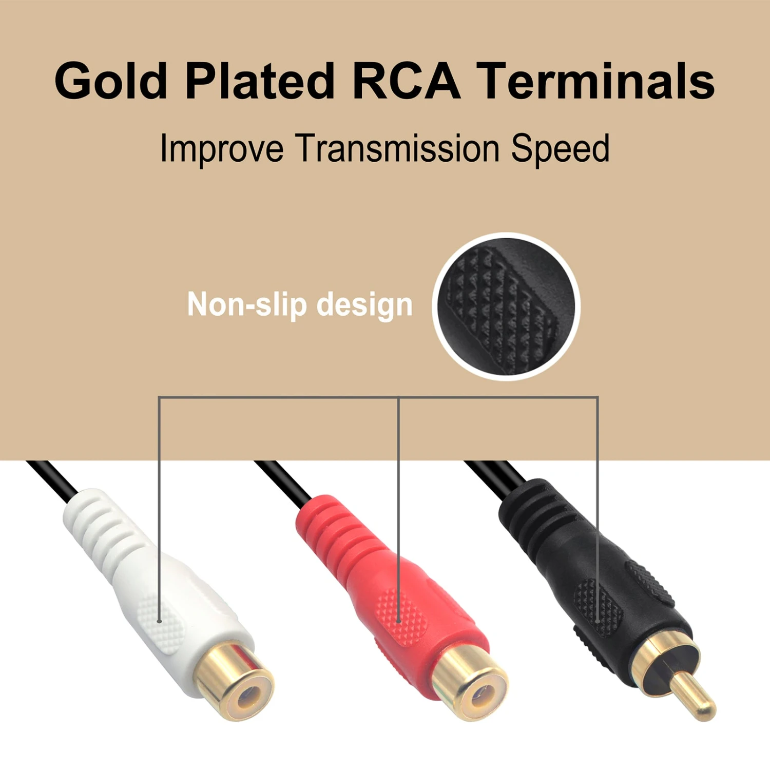 VCELINK 1 male to 2 female RCA splitter is ideal for splitting a mono source into two signals. The gold-plated connector ensures less loss of signal and the oxygen-free copper line combined with a double shielding allows for maximum audio quality. The red and white housing is designed to facilitate the distinction between the left and right channels and the anti-slip design of the female-to-male RCA splitter’s interface makes it easy to plug and unplug.