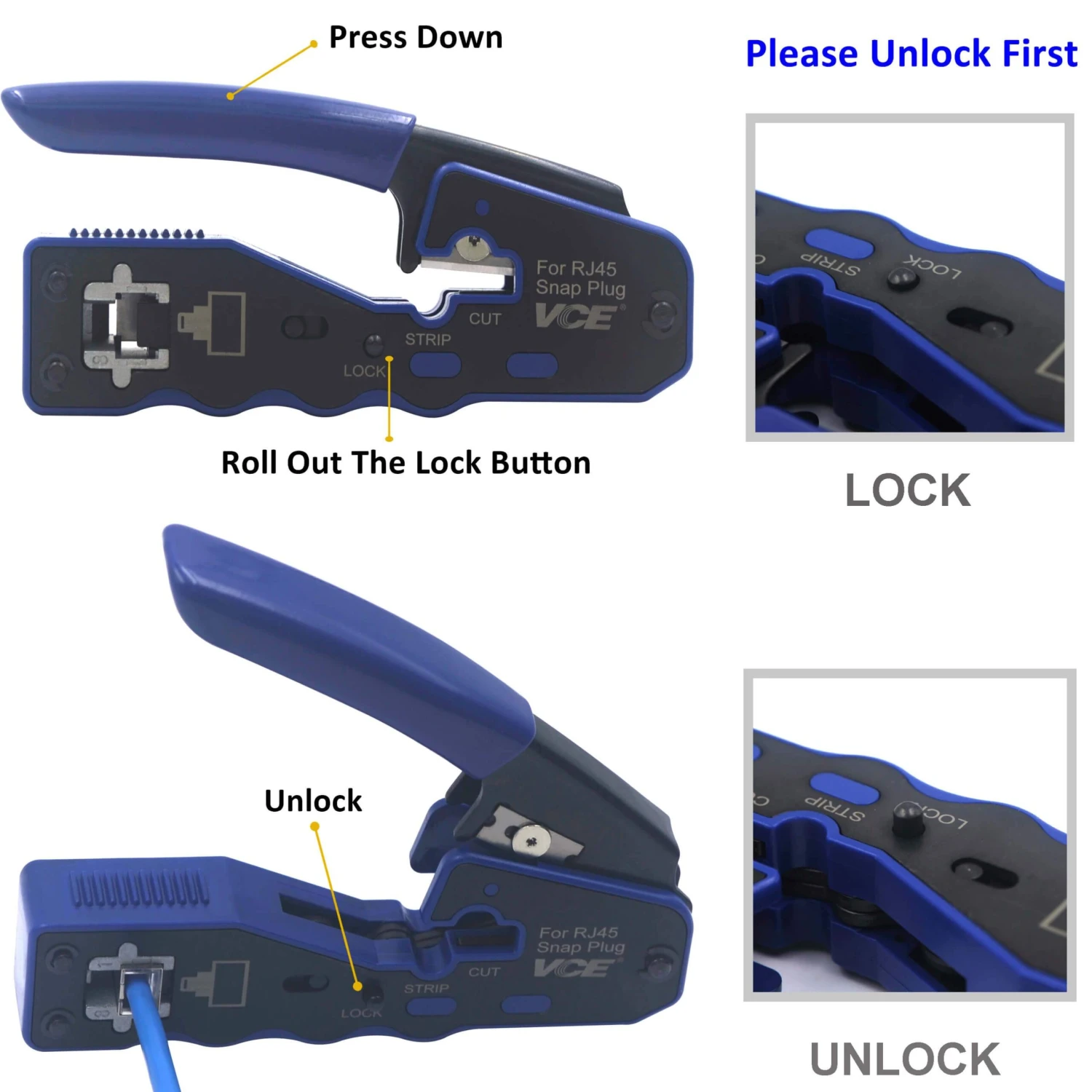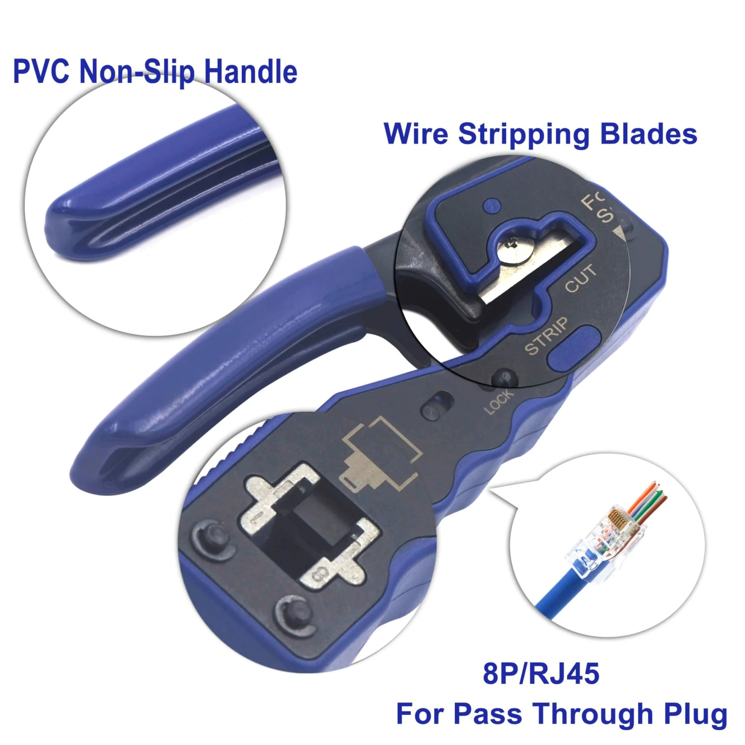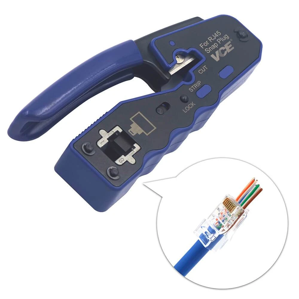 Find versatile RJ45 crimping tools for your network installation. VCELINK RJ45 Pass Through Crimper is your ultimate solution, combining the function of stripping, cutting, and crimping. Whether setting up a home or office network, this crimping tool simplifies the cable termination. With the VCELINK RJ45 crimper, you’re equipped to tackle any network installation with ease.