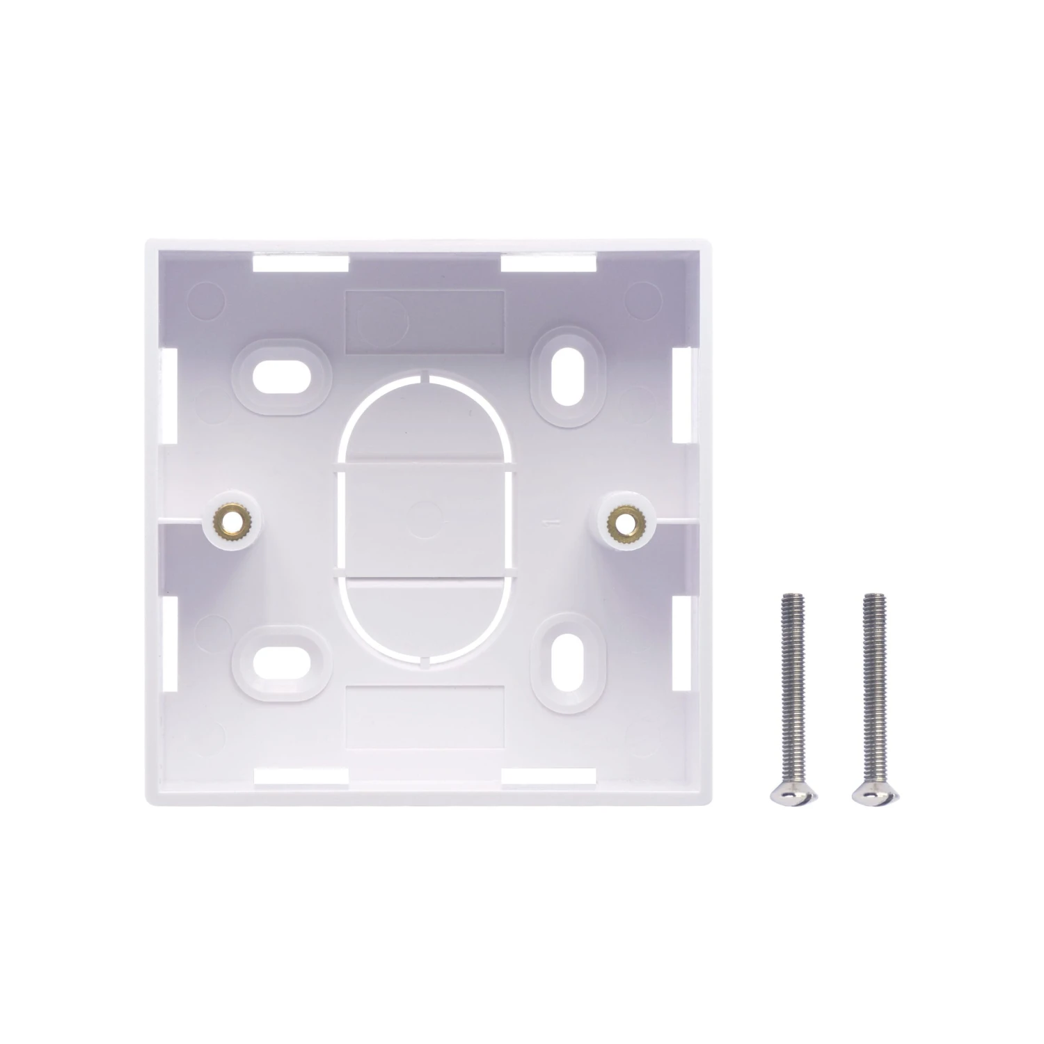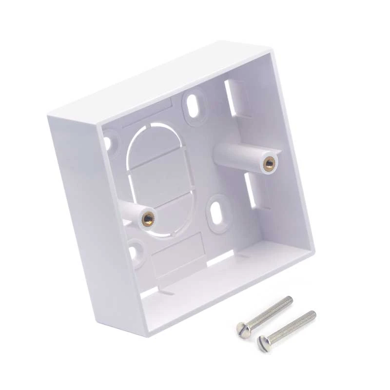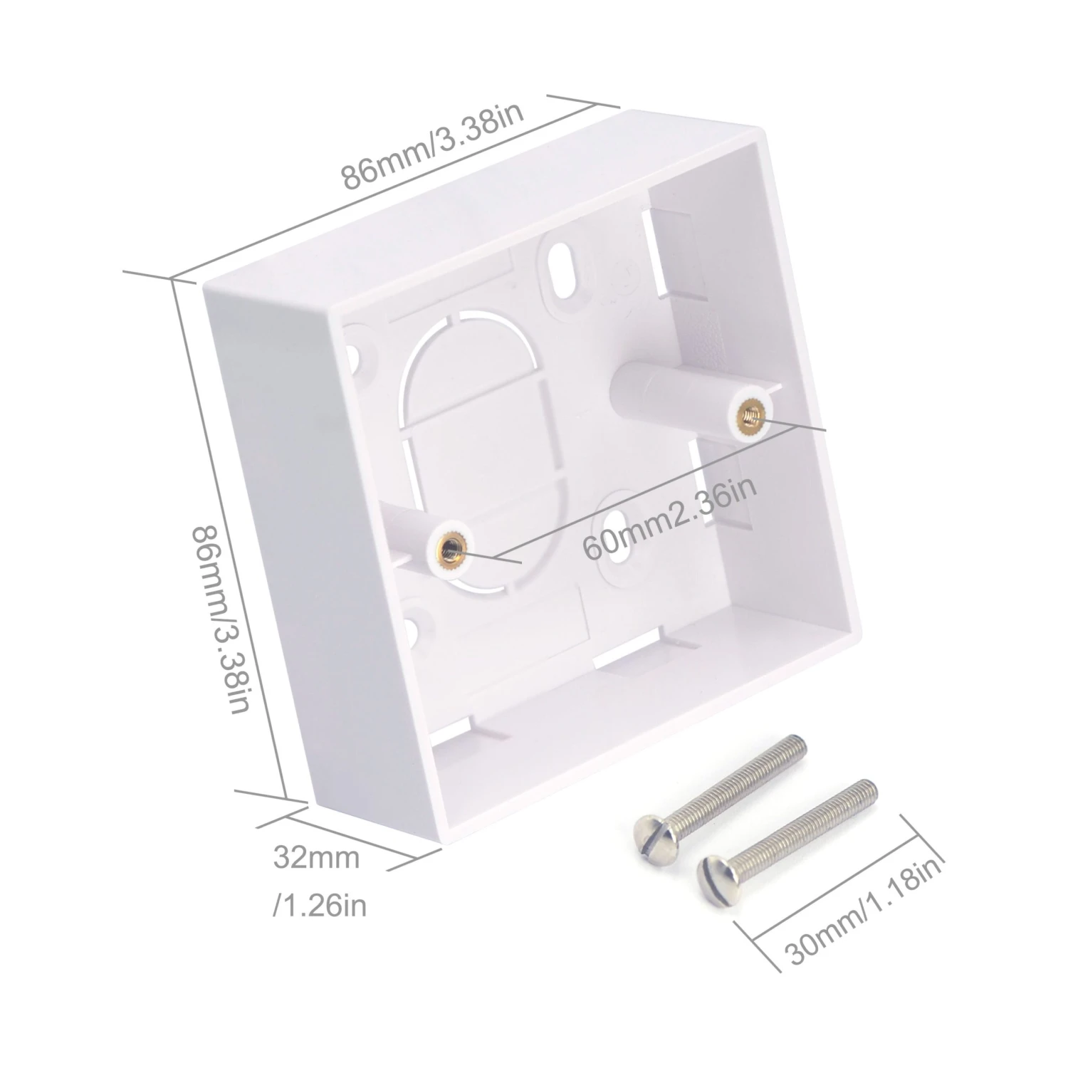 This single surface back box is compatible with UK standard brush wall plates and network wall plates; It features a size of 86 x 86 x 32mm, and the distance between the two screws is 60mm. ABS housing has high hardness, good heat resistance, and corrosion resistance. In addition, this 1-gang surface mount box with screws is easy to install.