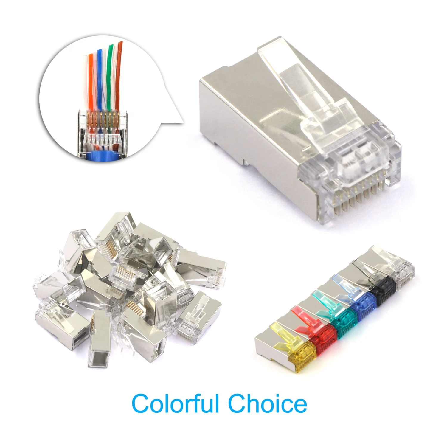VCELINK shielded, pass-thru Cat6 connectors allow you to check the correctness of wiring standards. The OD of the individual cable cores must be between 0.93 and 1.04 mm when used with the Cat6 connectors. The metal housing is designed to reduce interference and the gold-plated contacts provide resistance to oxidation and corrosion for stable data transmission.