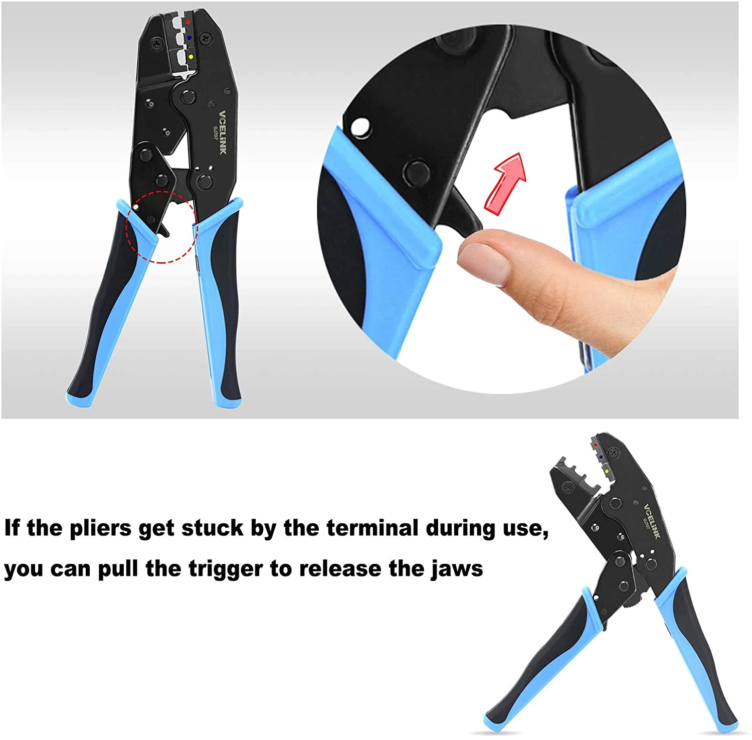 The VCELINK crimping tool for insulated terminals is perfectly suited for crimping cable lugs, wire end ferrules, and coaxial connectors. It is made of carbon steel for high strength and hardness, ensuring a long service life. The non-slip handle offers added comfort. The tool’s ratchet design makes it automatically unlock when the crimping is completed. There are three types of jaws for different wire gauge crimping.
